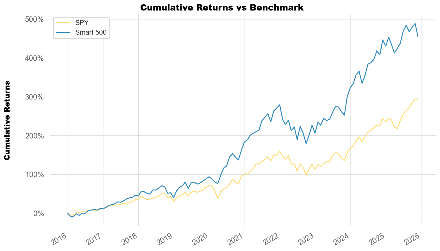 接著模型會將S&P 500成分股依照加權結果分組,Smart 500 選出分數前10%的股票組合,並且每個月底進行動態調整。